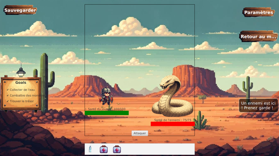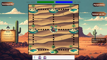 Le jeu dispose d'un système de génération aléatoire d'oasis et de monstres. Le joueur dispose d’une barre de vie, une barre d’objets et une barre d’eau qu’il doit remplir en buvant sa gourde. Attention, si le joueur n'a plus d'eau ou de vie, c'est le game over. Arriverez vous jusqu'au trésor ?